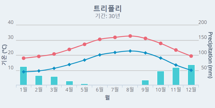 트리폴리는 지중해성 기후로, 여름은 덥고 겨울은 온화합니다. 여름철에는 기온이 30도 이상으로 올라가며, 겨울철에는 10도에서 20도 사이의 기온을 유지합니다. 비는 주로 겨울철에 내리며, 여름철에는 거의 내리지 않습니다. 여행 시 기후를 고려하여 적절한 옷차림을 준비하는 것이 중요합니다.