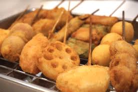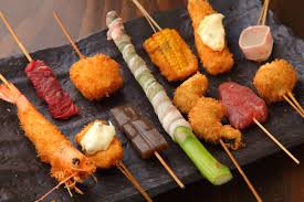 꼬치에 다양한 재료를 꽂아 튀긴 음식으로, 바삭한 식감이 매력적입니다. 소스에 찍어 먹는 재미도 있습니다.