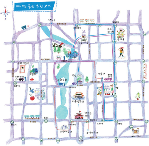 북경 중심부의 관광 루트를 강조한 손으로 그린 지도입니다. 다양한 명소와 공원이 표시되어 있어 여행에 유용합니다.