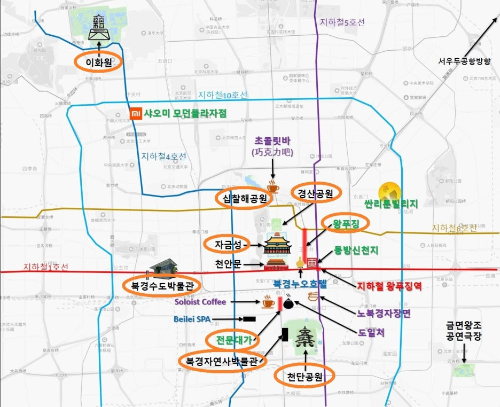 북경의 주요 관광지와 교통 노선이 표시된 상세 지도입니다. 관광객들이 쉽게 이동할 수 있도록 도와줍니다.